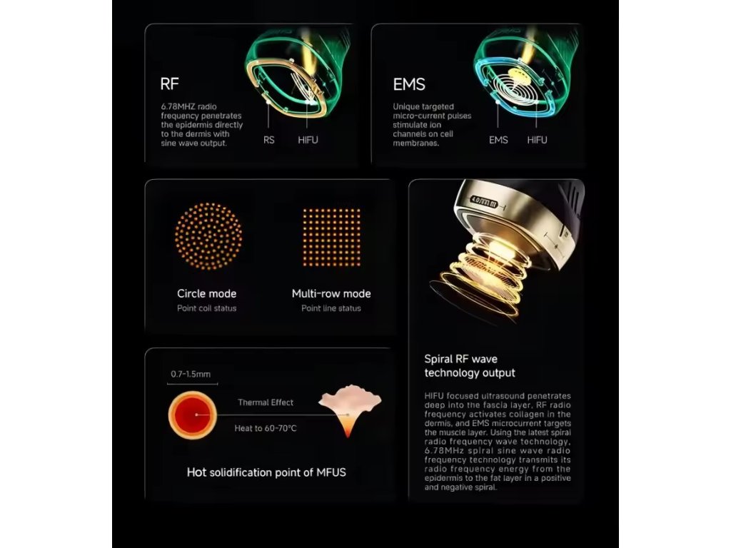 Zatímco tradiční HIFU přístroje (1D) vysílají pouze jednu linii bodů, technologie 25D pracuje na principu matrixového záření. Hlavice dokáže v jediném impulzu vytvořit hustou mřížku koagulačních bodů, což zajišťuje dokonale rovnoměrnou distribuci energie a výrazně zkracuje dobu ošetření.